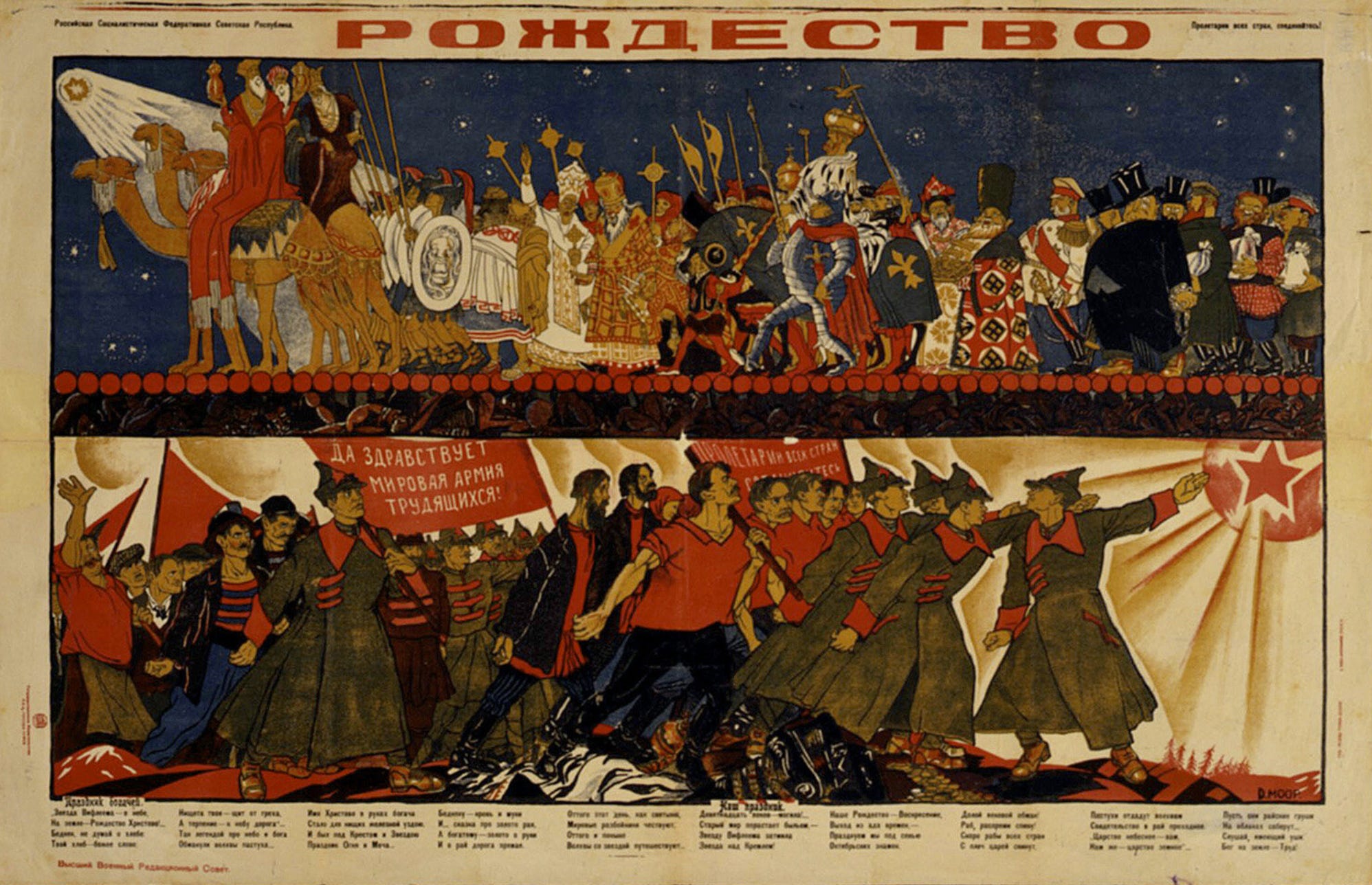 1921 poster contrasting the march of the three kings to Bethlehem (top), with the march of the workers towards communism (below).