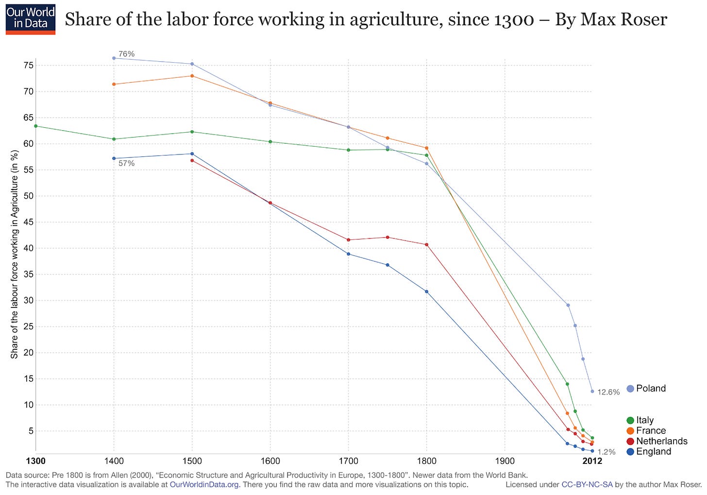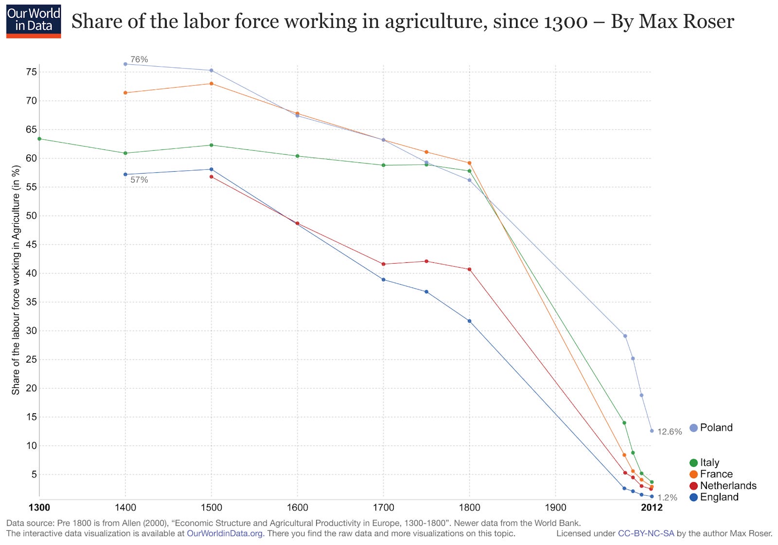 Fueled by the Industrial Revolution, life began to change rapidly in the 1800s. Young people left their family’s farm to move to the city and work in a factory. The below chart shows the percentage of the labor force working in agriculture over time (note: Russia isn’t on the chart, but it would most closely resemble Poland since it was apart of the Russian Empire).