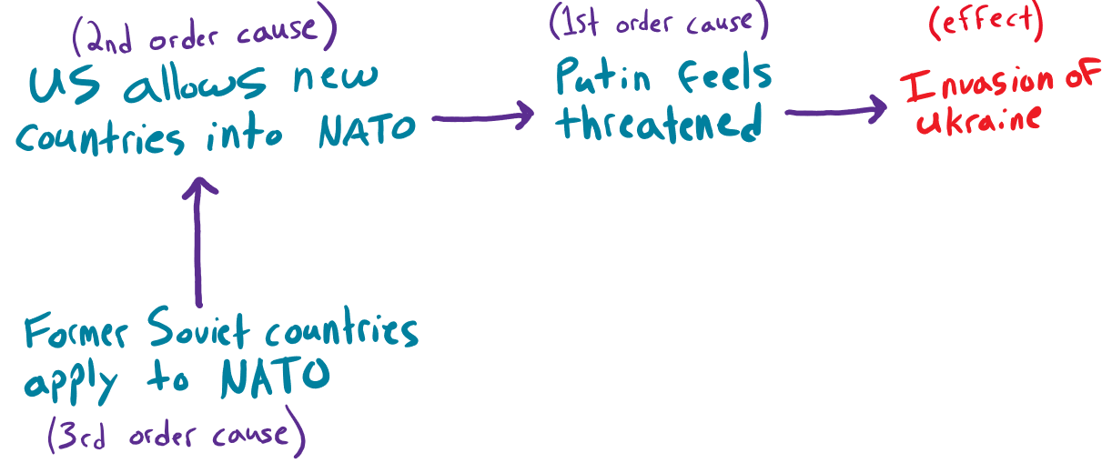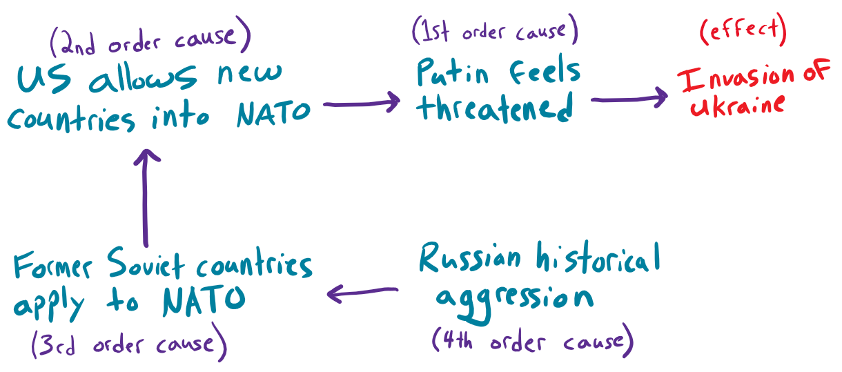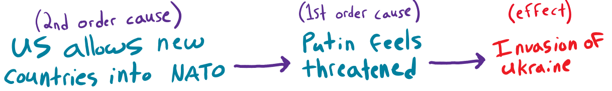 This is a really important one, because it touches on something that I have been intentionally trying to avoid, and that is multiple causal chains. There are plenty of potential causal chains for the Ukraine war that I just haven’t mentioned. Here is an example: Putin was bullied as a child (3rd order cause) --> Putin has an inferiority complex (2nd order cause) --> Putin feels that expanding the empire would make him look “great” in the history books (1st order cause) --> Invasion of Ukraine (effect). I don’t necessarily think this specific causal chain is correct, but it is possible. The point though, is that in order to determine that “Russia’s historical aggression” is the root cause, we would need to identify all other causes in all other causal chains. This is an exercise that would take a lot of time, and a lot of subjectivity.
