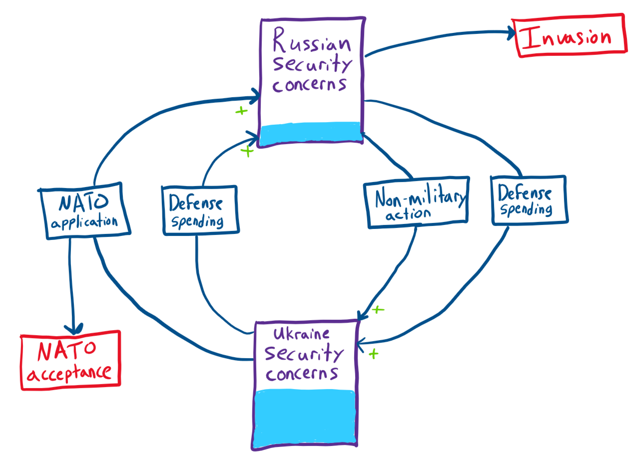 You may already see the issue. There is nothing in this system that will reduce either Russia’s or Ukraine’s security concerns, making this an unstable system. The positive feedback loop will eventually cause one of two things to happen, either Ukraine’s security concern reaches the point that they will petition to join NATO further increasing Russia’s security concern, or Russia’s security concern reaches its pinnacle, and they invade. Ultimately, this system will end with one of two exits: either Ukraine joins NATO or Russia invades (red boxes). Once one of these red boxes gets reached, we then move to a different system, with entirely different dynamics than this one.
