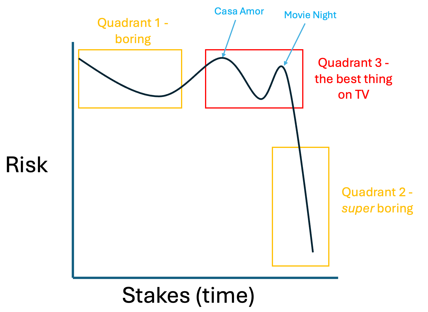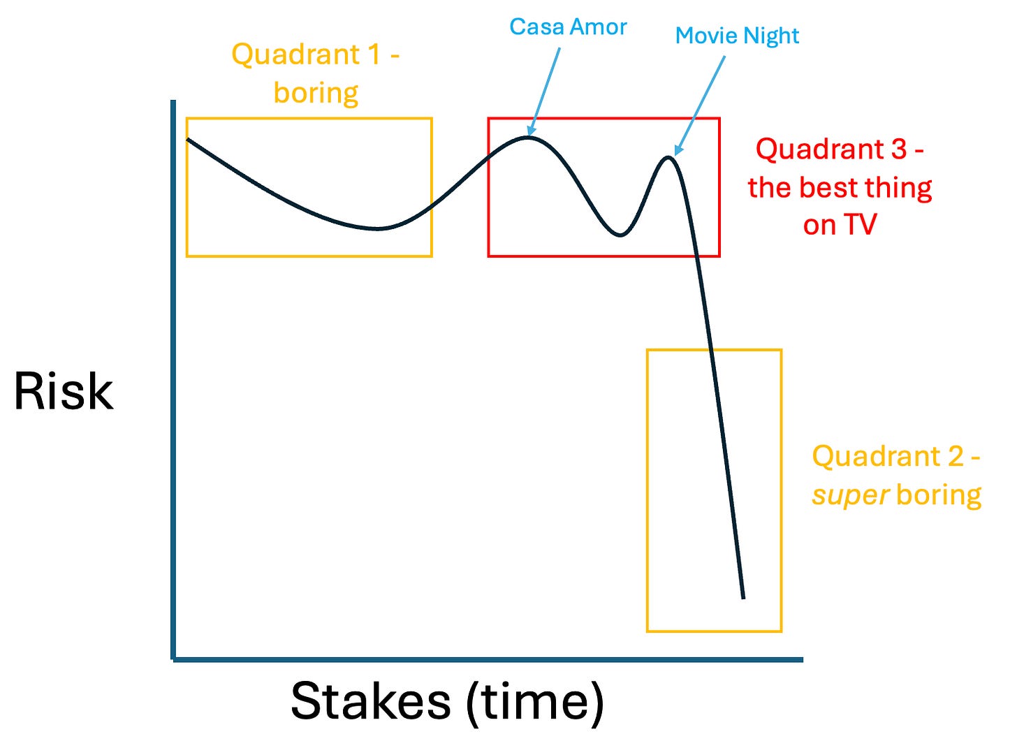 Love Island differs from other dating shows, like The Bachelorette, in that the ending is the least interesting part. I don’t think I’ve ever actually finished a Love Island season; it’s just not why you watch. The boredom arises from the opposite problem as Quadrant 1 — the stakes are high, but it doesn’t matter because the risk of a breakup has fallen to near zero, and the show loses its raison d’etre.