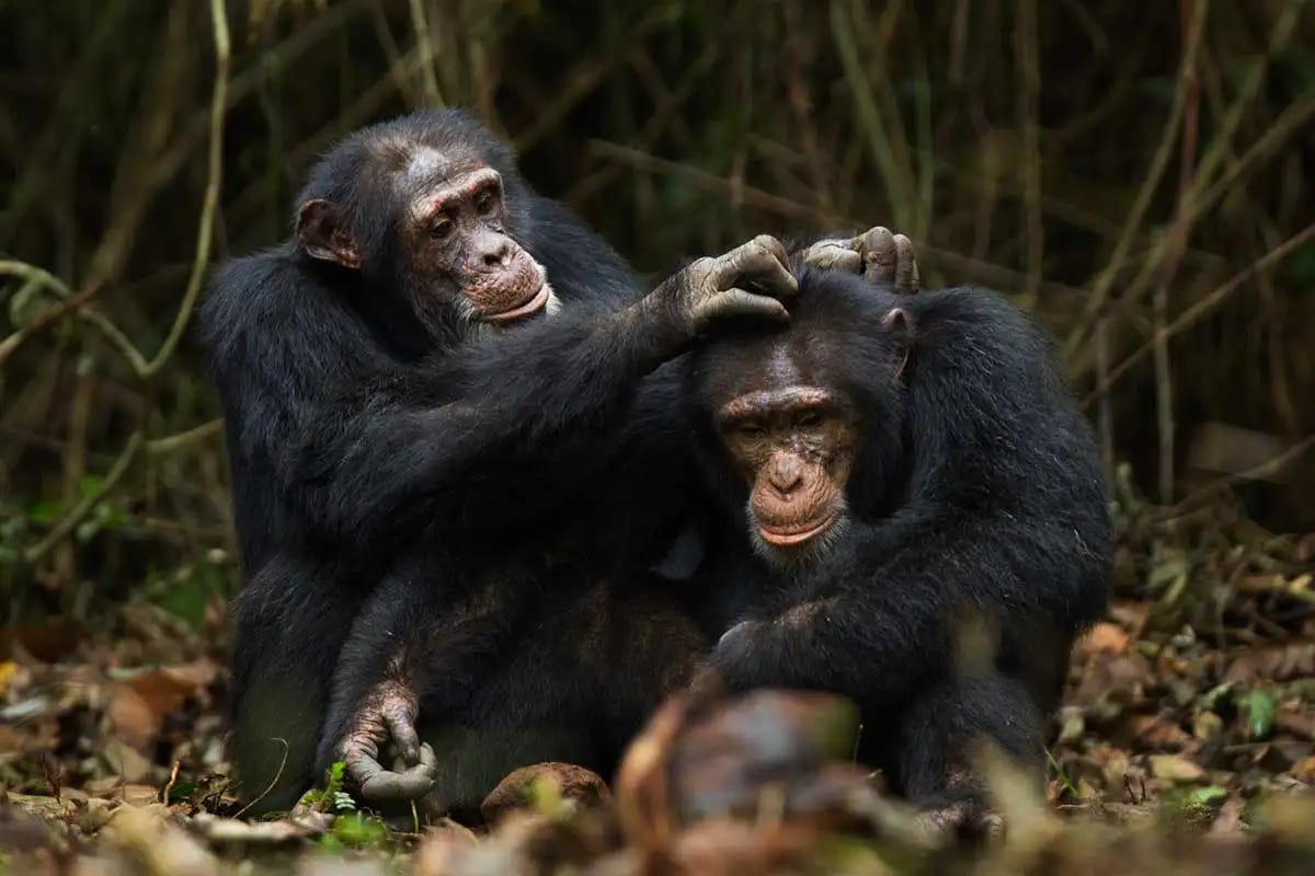 Many mammals live in groups to improve their reproductive odds. The great apes are especially social, managing complex social hierarchies. Large groups have many advantages, but maintaining their cohesion is hard. There needs to be a mechanism that builds trust and regulates cooperation, or else the group fractures. Non-human apes do this through grooming.