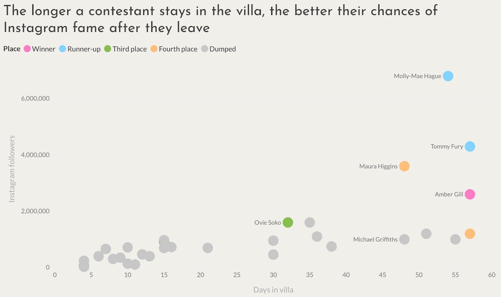 The astute reader may question the causality — it may not be the quantity that leads to fame, but instead those with influencer “qualities” tend to last longer. This may be partially true, especially for the real talents, but overall it doesn’t change the strategy: it is very hard to become famous from Love Island if you quickly get kicked off Love Island.