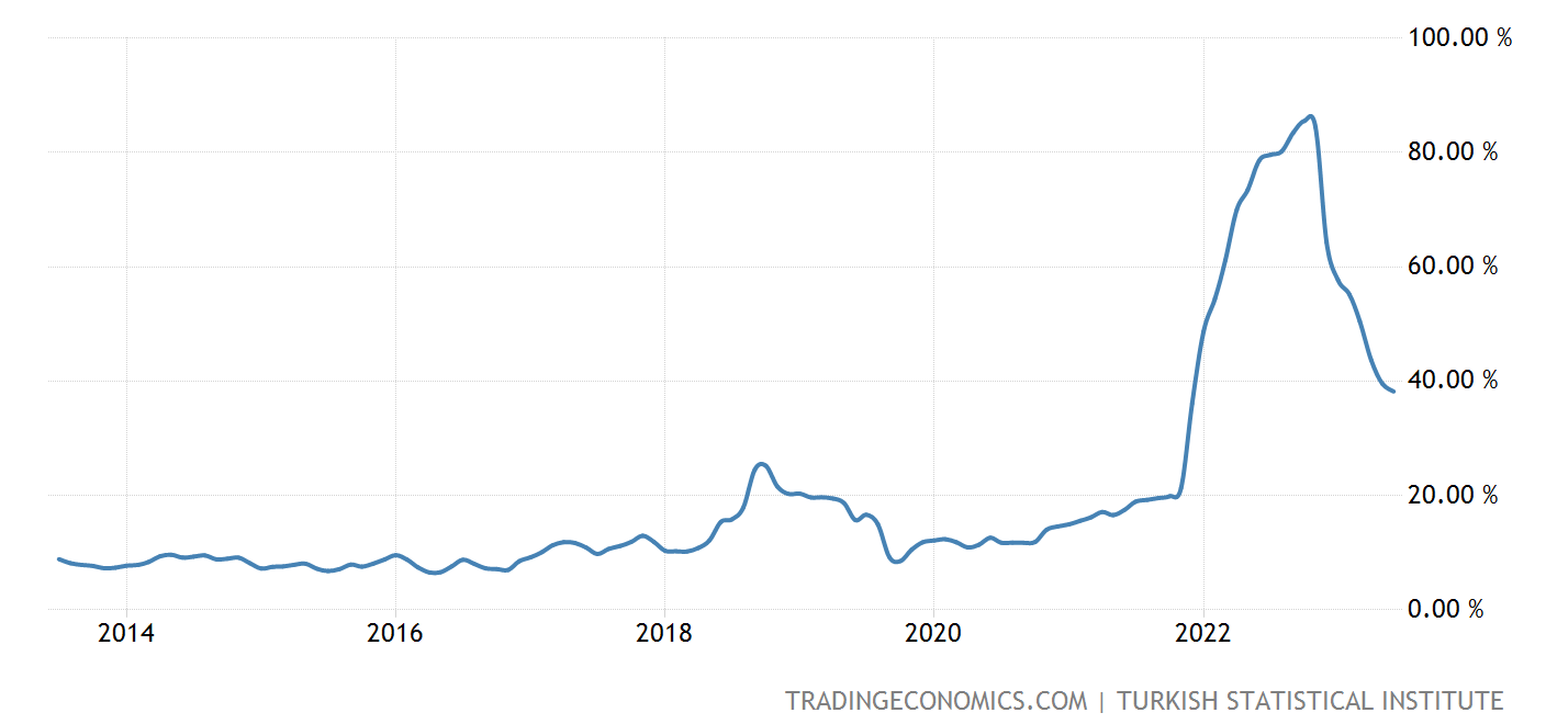 The regression you can see in the chart over the last 10 years has caused Erdogan’s popularity to slump during his second decade of rule. One of the key economic issues has been inflation: