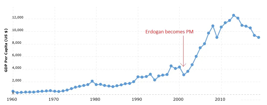 However, there is one thing that Erdogan has done decently well while ruling Turkey: the economy. Although it has gone down since 2013, at its peak Turkey’s GDP per capita was triple what it was when Erdogan came into office.