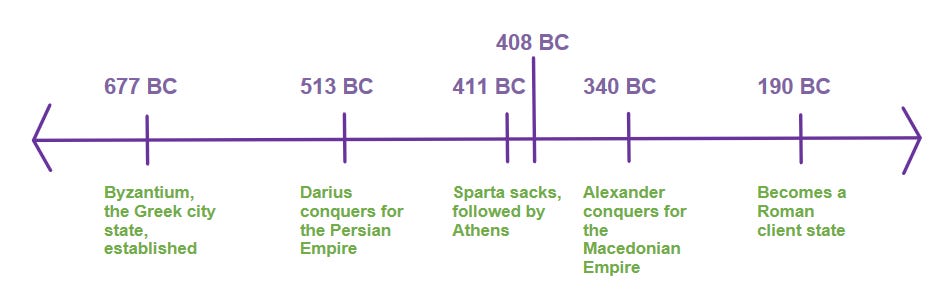 The city we now call Istanbul first entered into the historical record with Herodotus, who told us of a Greek named Byzas, who “founded” the city in 667 BC and named it Byzantium. Around this time, interactions between Eastern Europe and the Middle East were beginning to ramp up. Being right in the middle, Byzantium started getting passed around quite a bit.