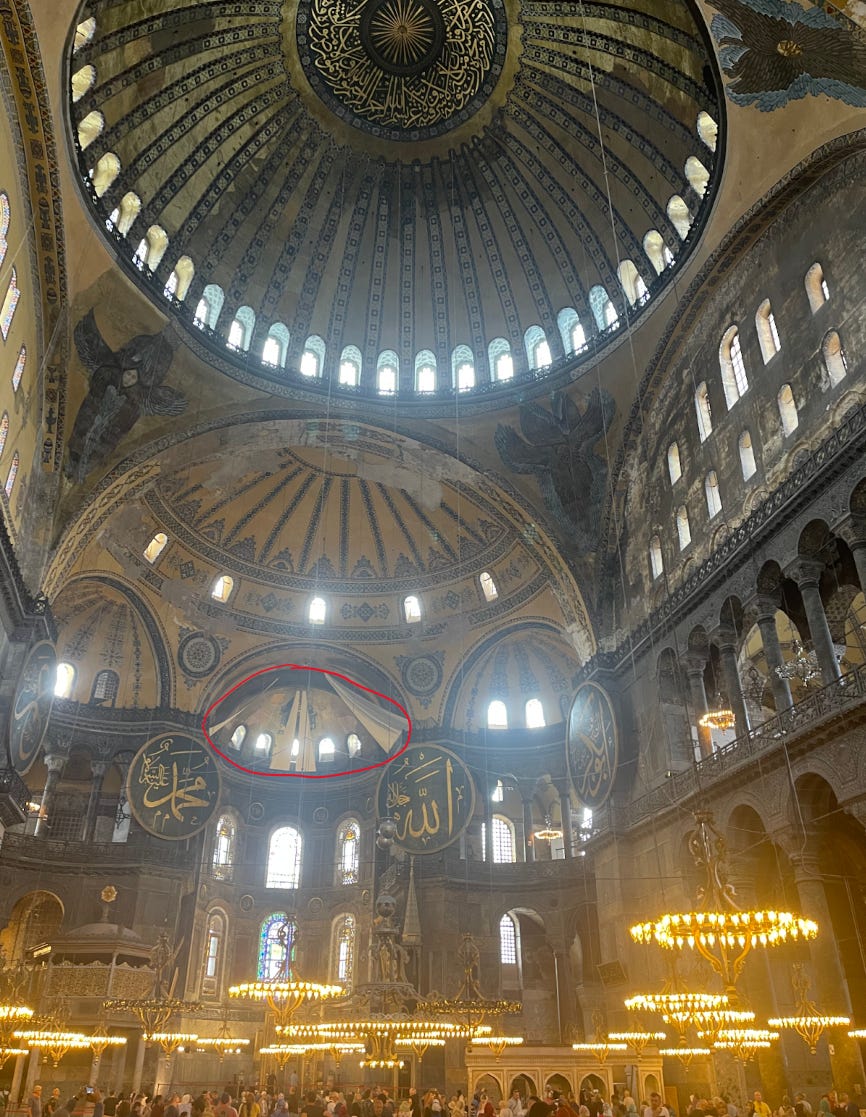 You can see above the tarps covering some of the images of Jesus. You also can clearly see the Arabic text circle things that were put up after the fact.