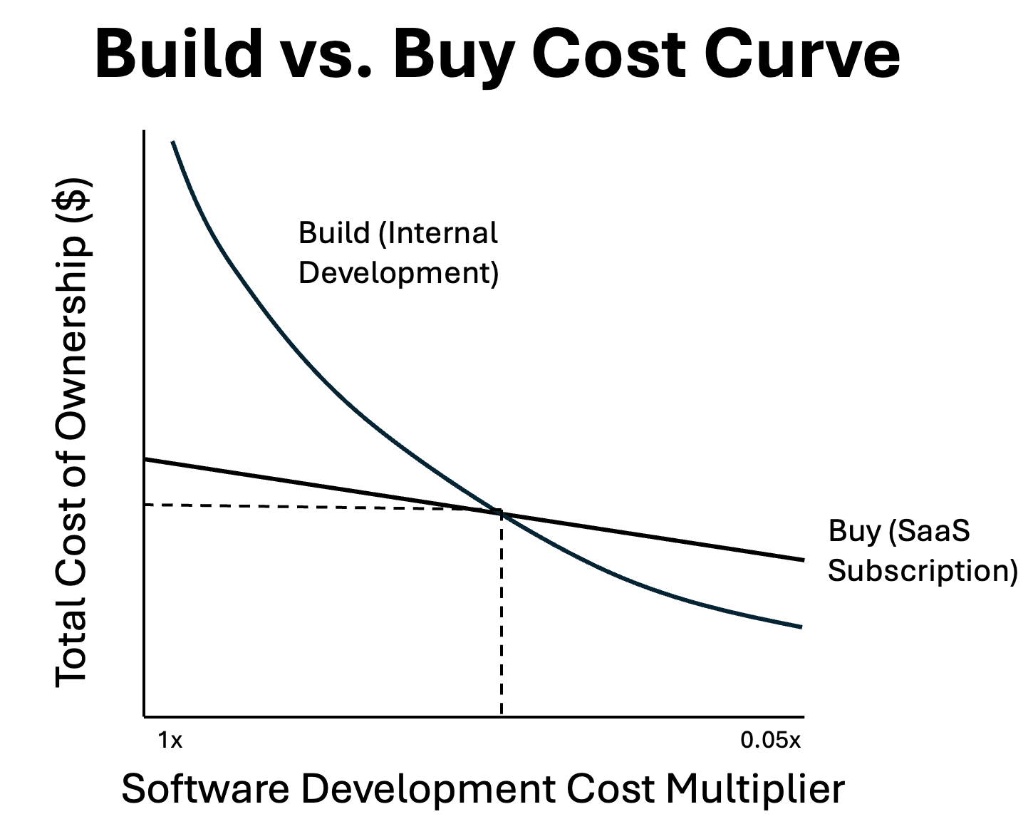 Once the software development cost comes down to where total cost of ownership (TCO) is less to build than to buy, the seller’s business is finished. However, we must also remember that AI will make SaaS companies more productive too, allowing them to drop their prices leading to lower TCO for the buyer. This is represented by the slope of the “Buy” line. I think it is reasonable to assume that the TCO for building will drop much faster than SaaS companies will drop their prices. Remember that the lack of a marginal cost allows SaaS prices to be based on an abstract “value-based pricing” model, which is why SaaS firms have notoriously high margins. While this does give them wiggle room to go down in price (goodbye cold brew and fitness stipends!), the compression will still fail to match the drop in build TCO.