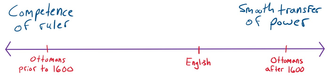 I don’t think there is any argument in this ordering when it comes to the smoothness of the transfer of power. The data proves it out strongly. The Ottomans did not have a significant war of succession after 1600, whereas before they happened almost every time. The English on the other hand, had succession issues semi-often over their entire history. As for competence, I see any instance of a succession war as leading to a more competent leader, hence the trade-off. However, I’ll note that it's difficult to actually prove “competence” by any quantitative measure.