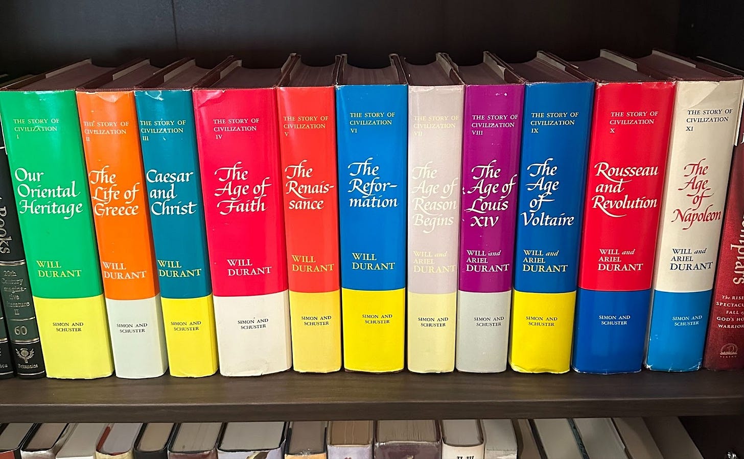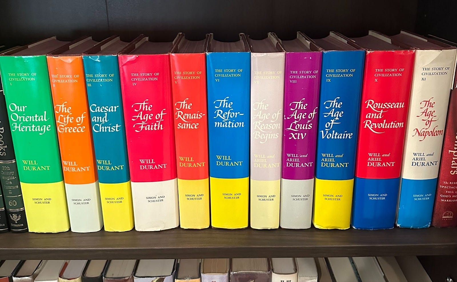 Will and Ariel Durant were highly influential 20th century historians. Their magnum opus was The Story of Civilization, which is 11 volumes covering the entire history of the Western world (and some of the East). Besides being a masterclass of history, The Story of Civilization tops the list of best bookshelf centerpieces. Once you first see their blindingly colorful 1960s book jackets, you will start to see them everywhere. I wasn’t able to resist…
