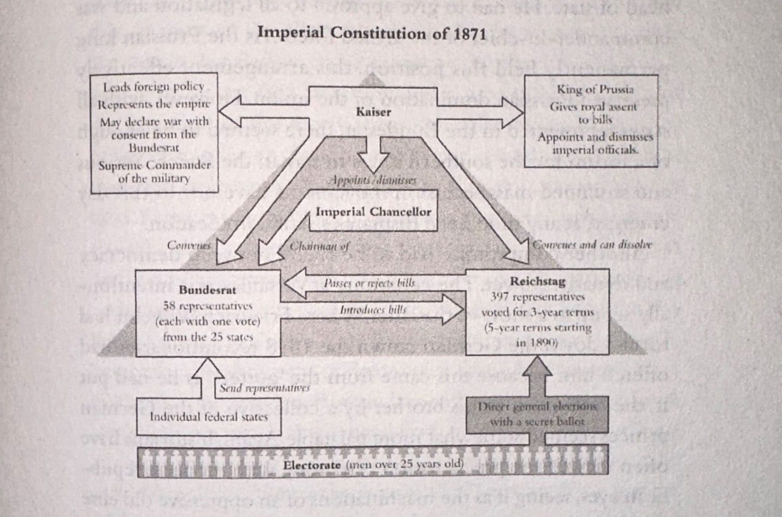 The Bundesrat and the Reichstag were very similar to the US Senate and House of Representatives, respectively. This seems to be the time-tested compromise between smaller and larger states. The big difference between most modern democracies though was the presence of the Kaiser, who would continue to be chosen by male-preference primogeniture from House Hohenzollern.