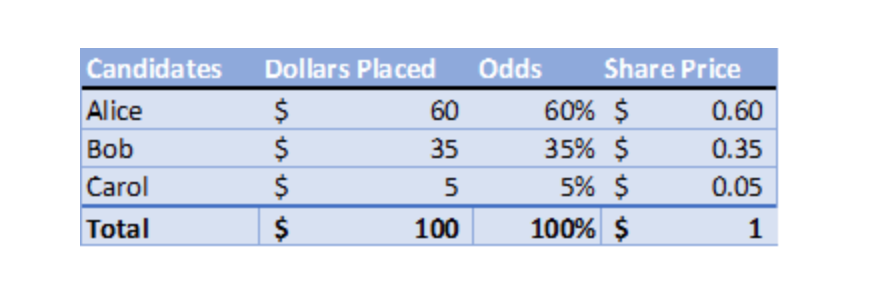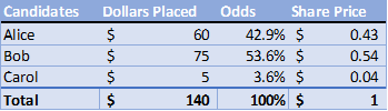 The total amount of dollars placed on each candidate determines the odds and share price for each candidate ($60, $35, and $5, in this case). Now let’s say that I want to make a bet on Bob, because I believe he has a better than 35% chance of winning. I decide to spend $40 giving me around 114 “shares” (40 / 0.35), with the hope that if Bob wins, my shares will become worth a total of $114. But if he loses I walk away with nothing.
