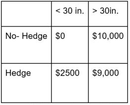 Our farmer needs at least 30 inches of rainfall in order to have a successful harvest. If there is < 30in of rainfall the farmer will not make any money, but any amount greater than that and he can have a full harvest netting him $10,000. The farmer is nervous because experts are predicting lower rainfall than usual, putting the farmer in danger of not being able to make any money this year. However, he finds (or creates) a prediction market for the odds of Brazilian rainfall being < 30in, allowing him to hedge the downside risk of lack of rainfall.